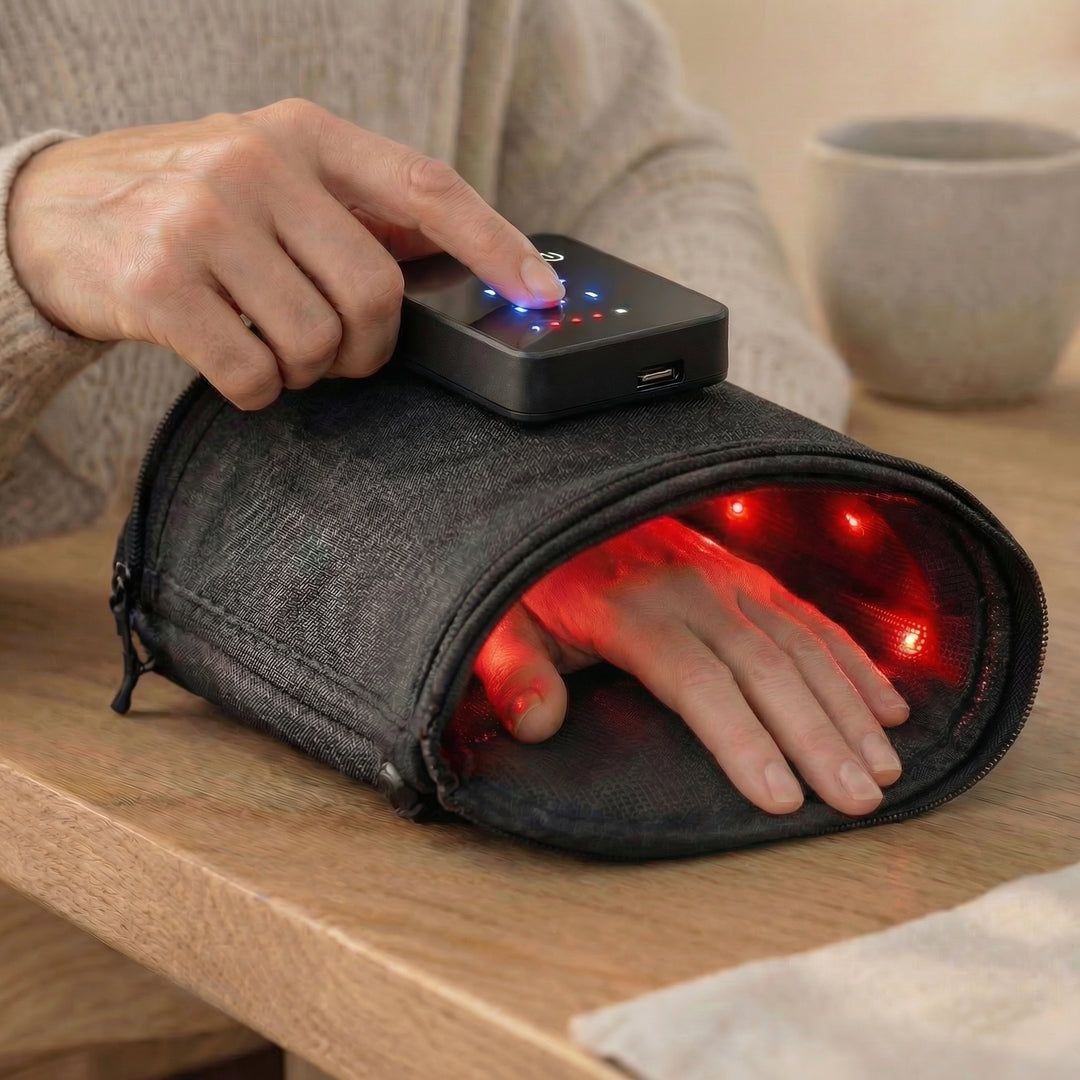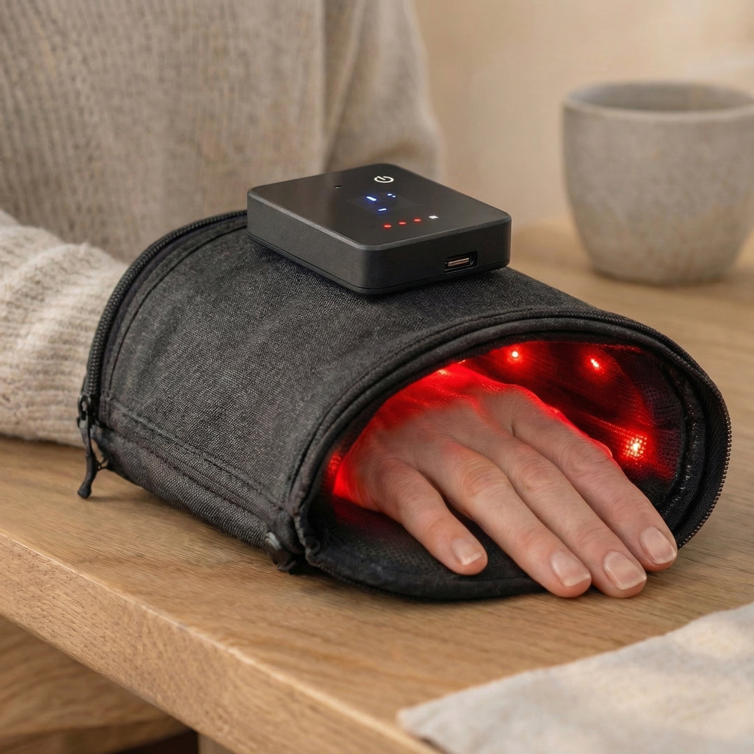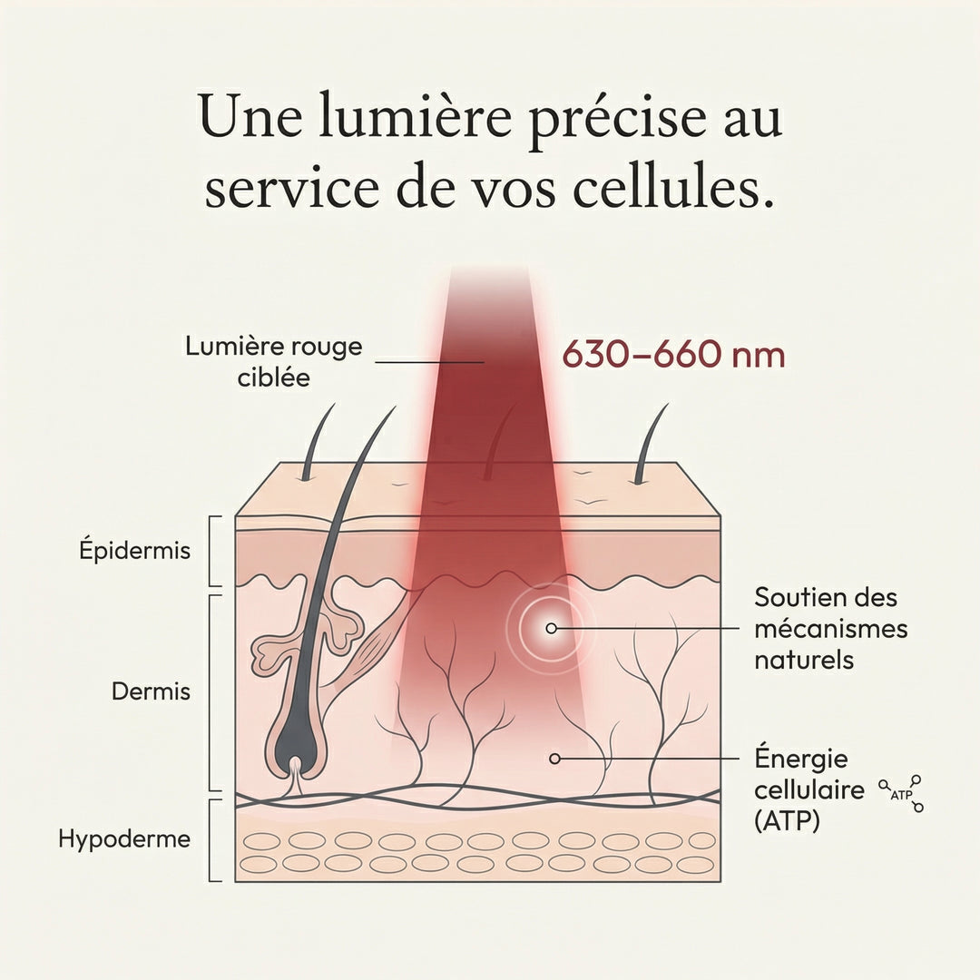 Une lumière rouge précise agit au cœur de vos cellules. Quatre mécanismes complémentaires pour un seul objectif : soutenir la récupération naturelle de vos mains.
